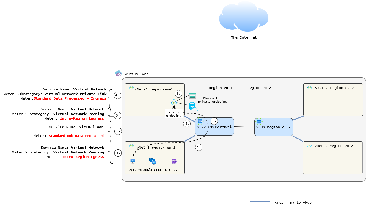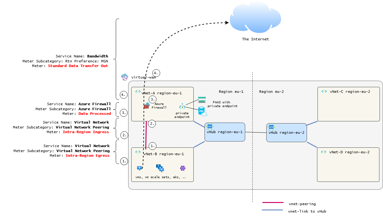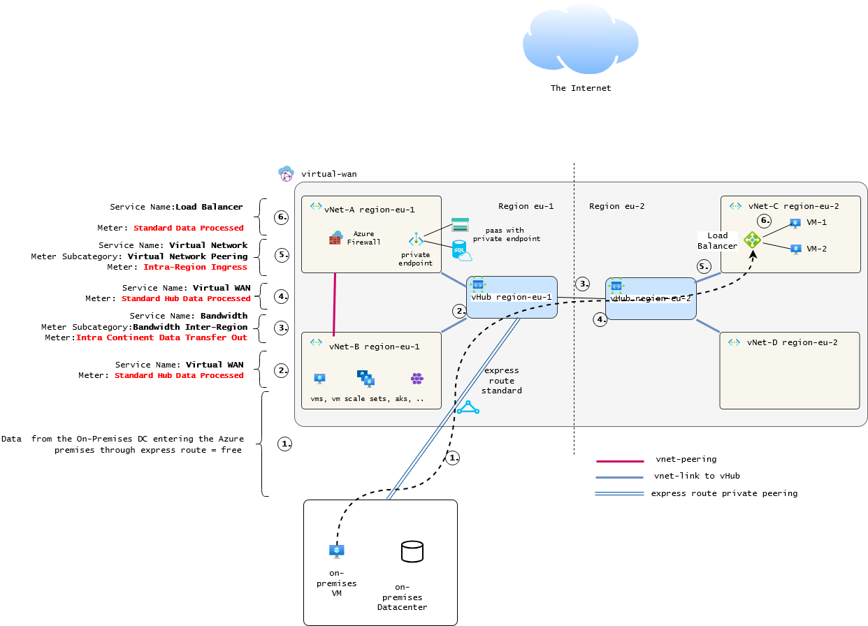 (3) The traffic is routed to the vWan Hub in the destination region through the microsoft backbone which is billed accordingly.